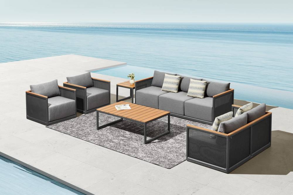 Elevate your outdoor living with the Milano Collection — where clean lines meet effortless comfort. Featuring a sleek charcoal aluminum frame with modern mesh paneling and warm wood-accented armrests, this set blends contemporary design with inviting texture.